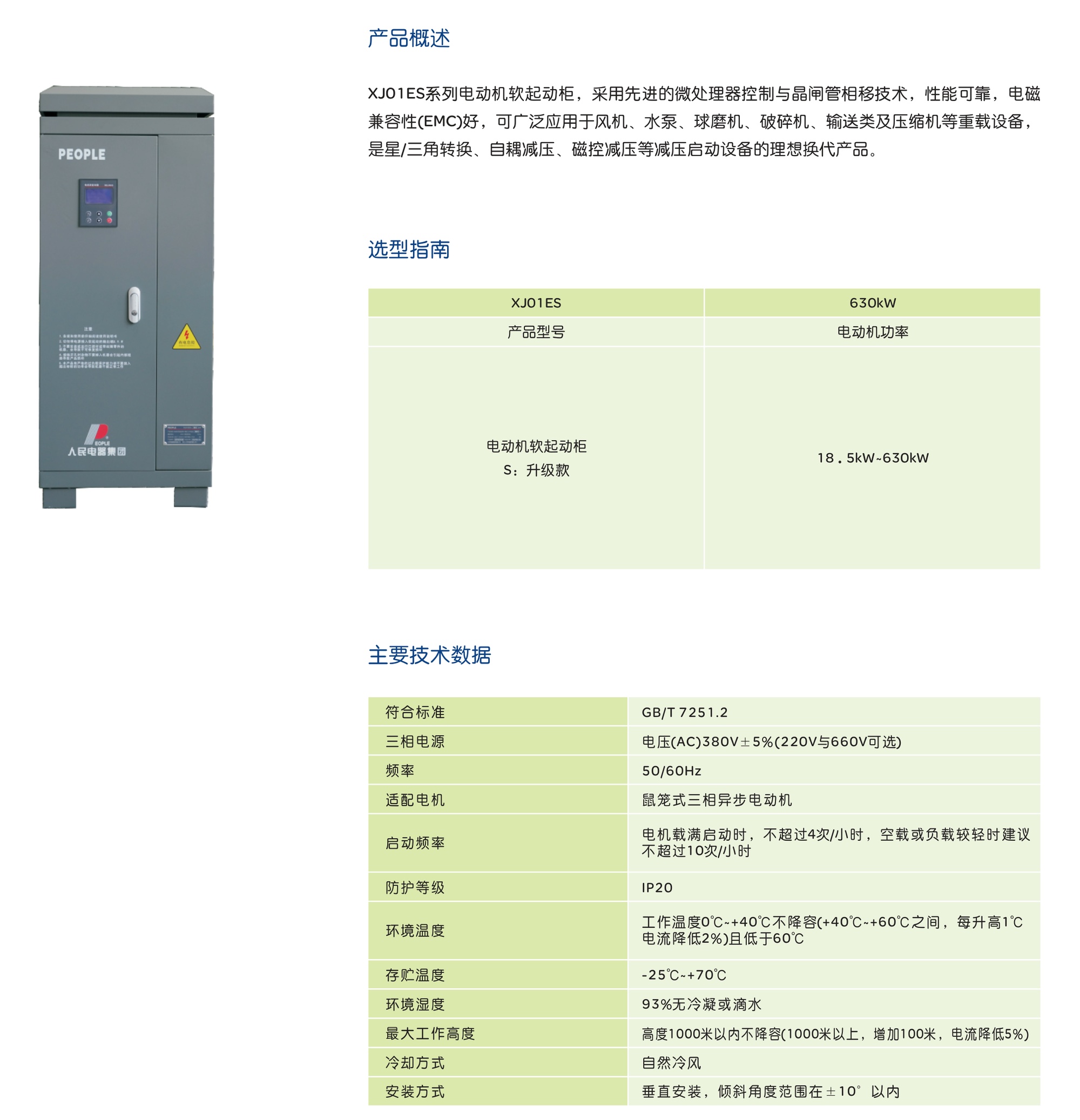 XJ01ES系列电动机软起动柜,采用先进的微处理器控制与晶闸管相移技术,性能可靠,电磁兼容性(EMC)好,可广泛应用于风机、水泵、球磨机、破碎机、输送类及压缩机等重载设备,是星/三角转换、自耦减压、磁控减压等减压启动设备的理想换代产品。